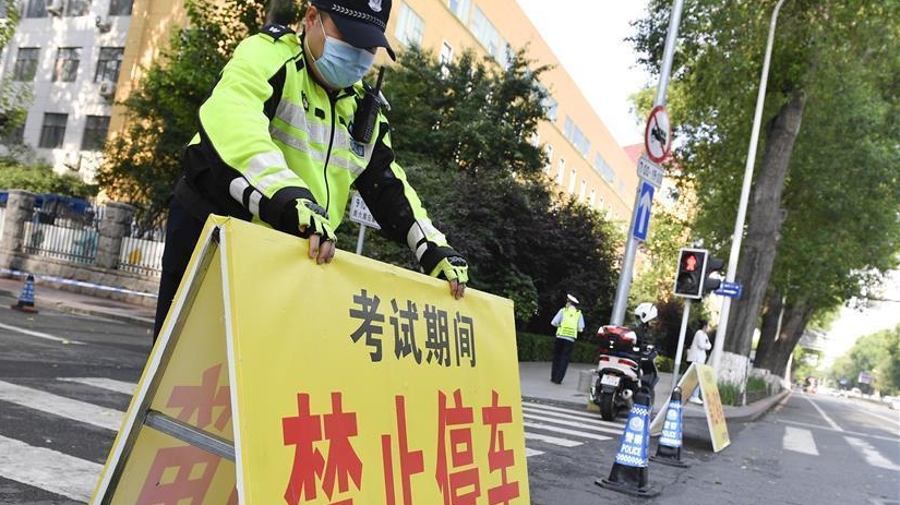 7月7日,在吉林省長春市的東北師范大學附屬中學考點外,執(zhí)勤交警在道路上架設提示牌。