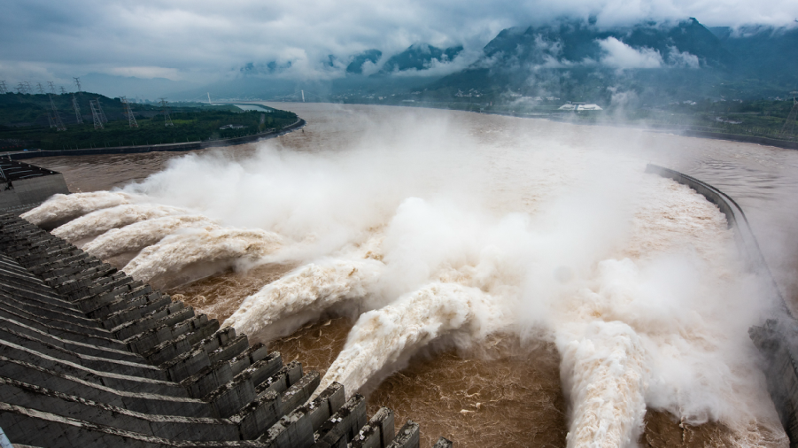 2020年7月25日,湖北宜昌,三峽樞紐開啟泄洪深孔泄洪。
