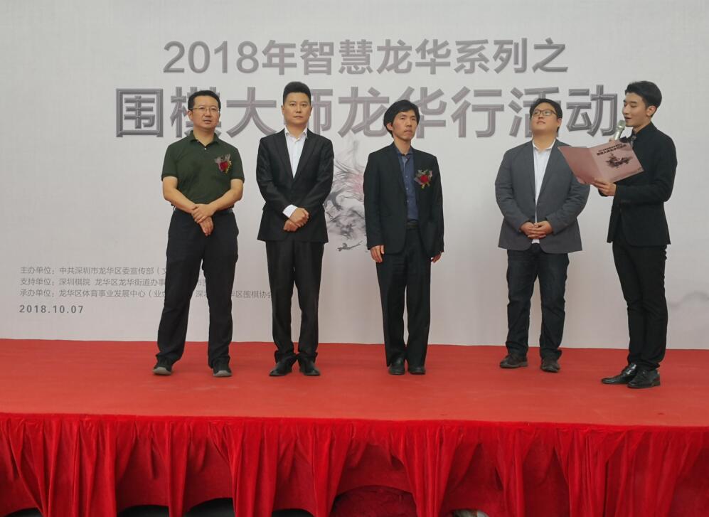 開幕式上,龍華區(qū)委副書記苗寧禮,龍華區(qū)委常委、宣傳部長黃啟鍵及區(qū)文化體育局相關(guān)負責(zé)人等在百忙中前來為“智慧龍華”捧場加油?;顒釉谳p松熱鬧的歌舞中拉開帷幕,文化體育局負責(zé)人在致辭中對諸位圍棋大師的到來表示熱烈的歡迎,對活動擴大中華圍棋文化的傳播,推動龍華區(qū)圍棋的發(fā)展給予了充分的肯定。隨后,黃啟健常委代表龍華區(qū)聘請李昌鎬大師擔(dān)任龍華區(qū)圍棋發(fā)展的名譽顧問并頒發(fā)了證書,李昌鎬則回贈了簽名棋盤。緊接著,孔杰老師也給參加活動的小棋手贈予了簽名棋盤。在廣東圍棋總冠軍佟云老師簡要介紹李昌鎬、孔杰的精采圍棋經(jīng)歷之后,活動主持人還現(xiàn)場采訪了李昌鎬、孔杰,就兩人圍棋從業(yè)過程中的難記經(jīng)歷、精采賽事以及對人工智能圍的展望等進行了提問,兩位大師的回答坦率、誠懇,贏得了現(xiàn)場觀眾的陣陣掌聲?;顒拥母叱笔抢畈€、孔杰、車澤武、張亞博四位老師與龍華區(qū)的圍棋愛好者進行多面打的活動,梁偉棠九段和徐瑩老師還進行掛盤講解。
