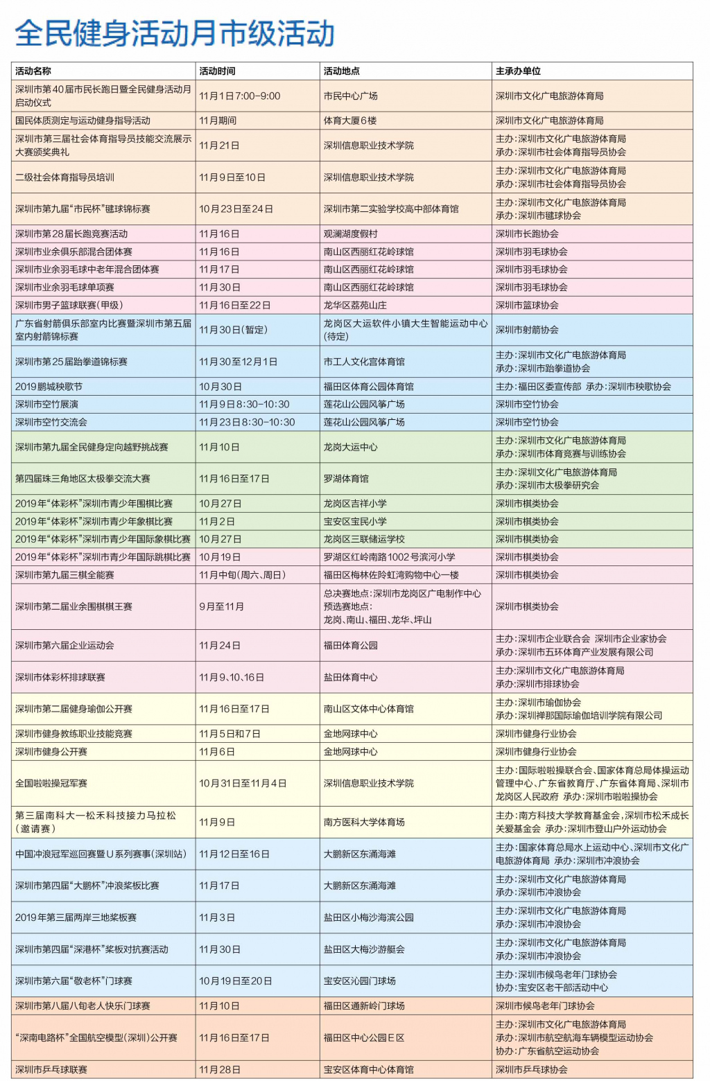 11月期間,深圳將舉辦37場市級活動,內(nèi)容包括跑步、籃球、羽毛球、射箭、跆拳道、秧歌、定向越野賽、太極拳、排球、棋類等比賽以及國民體測與健身指導等系列活動。同時,全市各區(qū)、各單位也因地制宜地將舉辦百余場方便市民參與的全民健身活動,涵蓋項目豐富多彩,最大限度地滿足市民群眾的健身需求。