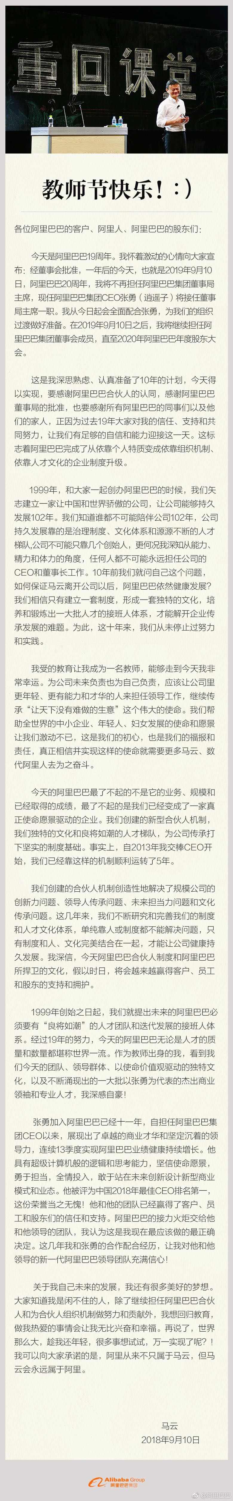 智通財(cái)經(jīng)APP獲悉,阿里巴巴官方微博和微信公眾號(hào)均發(fā)布了一封馬云的公開(kāi)信,信中表示,一年后的阿里巴巴20周年之際,即2019年9月10日,他將不再擔(dān)任集團(tuán)董事局主席,屆時(shí)由現(xiàn)任集團(tuán)CEO張勇接任。