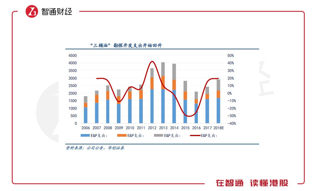 智通財(cái)經(jīng)APP了解到,4年的行業(yè)低迷期,中石油、中石化、中海油合計(jì)用于勘探、開(kāi)發(fā)的資本支出從2014年的3954億元人民幣(單位下同),下降至2016年的2112億元,“三桶油”國(guó)內(nèi)原油產(chǎn)量也從2014年的13.63億桶下降至2017年的12.50億桶。
