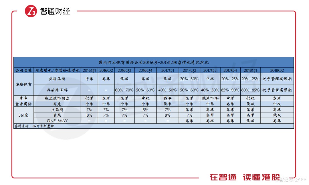 智通財經(jīng)APP根據(jù)公開資料整理發(fā)現(xiàn),特步過往季度的同店銷售增長水平時常保持在中單位數(shù)甚至低單位數(shù)的增長水平,直到2018年一季度才實(shí)現(xiàn)低雙位數(shù)增長,這也是公司自2013年一季度開始披露這一數(shù)據(jù)以來,首次達(dá)到雙位數(shù)增長。