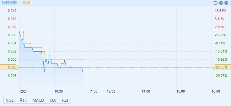 香港生命科學(xué)(08085)面臨出牌,股價重挫,截至11時18分,跌24.32%,報價0.028港元,成交額78.43萬。