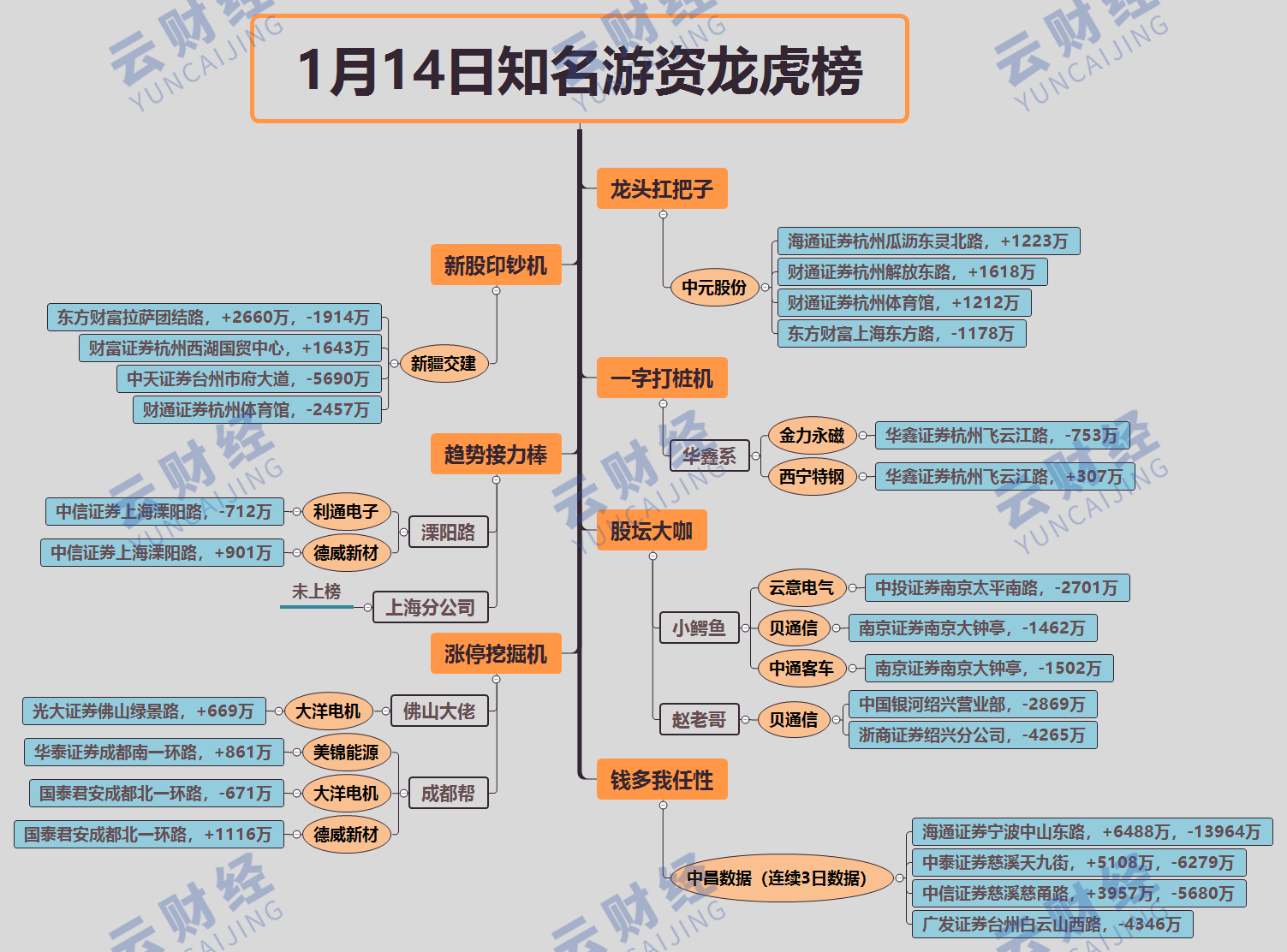 其他游資方面,趙老哥兩席位合計賣出貝通信(603220)7134萬,小鱷魚賣出云意電氣(300304)、貝通信(603220)、中通客車(000957)各2701萬、1462萬、1502萬,佛山幫買入大洋電機(002249)669萬。
