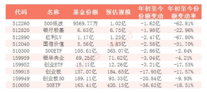 年初至今股票ETF份額下降TOP10:以創(chuàng)業(yè)板為首的股票型ETF份額下降最多,其中華安創(chuàng)業(yè)板50ETF(159949)份額下降20.84億份,易方達(dá)創(chuàng)業(yè)板ETF(159915)份額較年初下降17.93億份,廣發(fā)創(chuàng)業(yè)板ETF(159952)份額下降3.21億份。