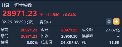 恒生指數(shù)開盤漲0.04%%,報(bào)28971.23點(diǎn)。國企指數(shù)張0.19%,報(bào)11653.15點(diǎn)。紅籌指數(shù)張0.13%,報(bào)4565.49點(diǎn)。