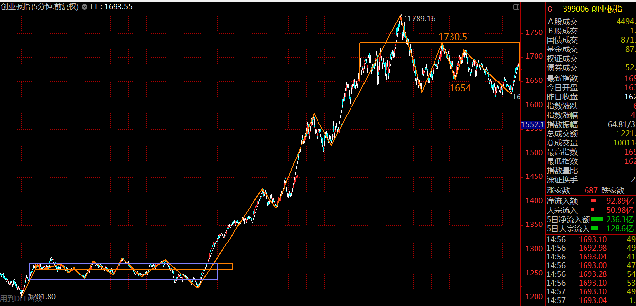 創(chuàng)業(yè)板方面,前面一段走的比較強(qiáng)勢,這里僅構(gòu)建了一個五分鐘級別的中樞,整體走勢上要強(qiáng)于主板,這里還是先看中樞級別擴(kuò)展,兩相結(jié)合,下周兩市大概率會以強(qiáng)勢震蕩、蓄勢突破為主。