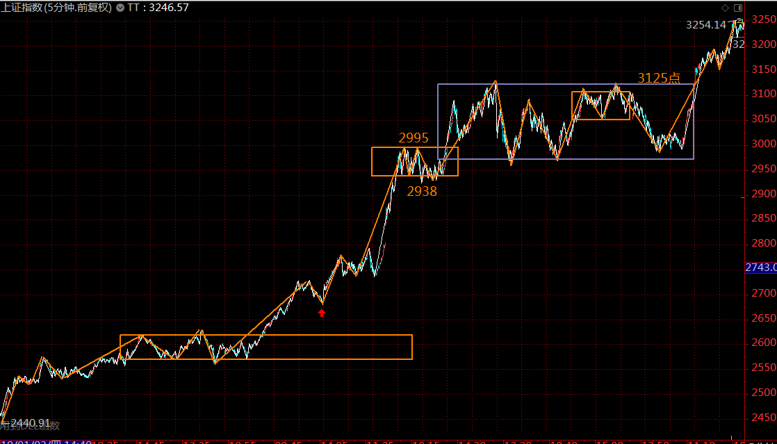 從小級別看,上證指數(shù)結(jié)構(gòu)較為清晰,上周市場突破后進入背馳段,這里隨時會回踩3125點確認。該點位若確認有效支撐,則將構(gòu)成這波上漲行情的第一個30分鐘級別第三類買點,是一個絕佳的買點。若跌回3125點,則繼續(xù)看中樞震蕩,操作方式則為在2968點-3125點之間高拋低吸,同時關(guān)注2968點支撐。3125點附近,市場將如何運行是本周市場最大的看點