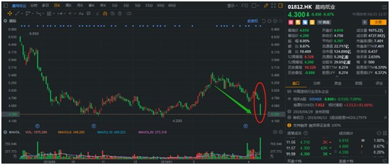 近日,大龍頭紙企晨鳴紙業(yè)(01812)發(fā)布2019年一季度業(yè)績預(yù)告,同比94.25%-96.17%的下滑,直接讓已經(jīng)近30多個(gè)交易日不斷下跌的股價(jià),再度迎來大跌。截止4月15日早盤,晨鳴紙業(yè)大跌9.47%,僅半日交易量、成交額達(dá)到1075萬股、4728萬港元,是前一整日交易量的近9.5倍。