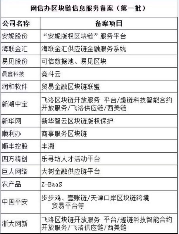 第一批區(qū)塊鏈信息服務備案于3月30日發(fā)布:A股公司涉及安妮股份、海聯(lián)金匯、易見股份、晨鑫科技、潤和軟件、新湖中寶、新華網、順利辦、順豐控股、四方精創(chuàng)、巨人網絡、農產品、中國平安、浙大網新。