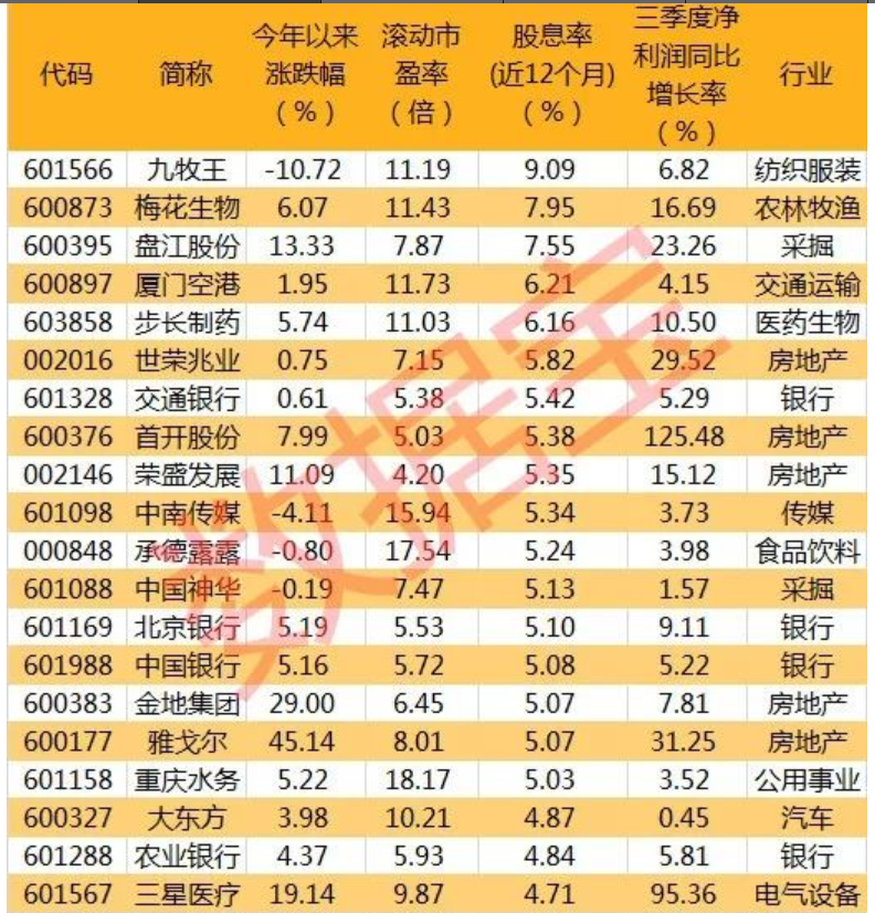 3、高股息率股票貴在穩(wěn)健、安全,長期看,即使市場出現(xiàn)長期調(diào)整,高股息個(gè)股也可以給投資者帶來穩(wěn)定的現(xiàn)金收入;目前高股息率個(gè)股的整體估值較低,根據(jù)以下條件篩選高股息率潛力股:1、滾動市盈率小于20倍;2、2016、2017、2018連續(xù)三年股息率大于4%;3、最近12個(gè)月股息率大于4%;4、前三季度凈利潤同比增長。