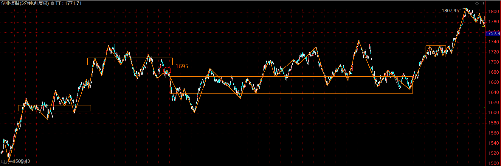 目前分析只需集中于這個(gè)五分鐘的上漲趨勢即可,上周如期做出了五分鐘上漲趨勢第二個(gè)中樞的雛形。前面幾天表現(xiàn)其實(shí)蠻超預(yù)期的,特別是科技股的逼空,A股似乎許久未見了。核心問題出在周五,周五有兩個(gè)點(diǎn)顯示出當(dāng)下市場的外強(qiáng)中干,第一個(gè)在于周五早盤南京證券反包漲停時(shí),市場資金的失衡,明顯看出科技股與券商股兩臺“抽水機(jī)”從前幾天的互相配合變成了互相傷害;這一段跳水直接將圖形破壞,強(qiáng)度大的新高背馳可以說已經(jīng)沒有了,那下午上拉無力后的跳水也就在情理之中。