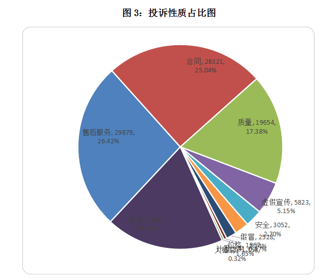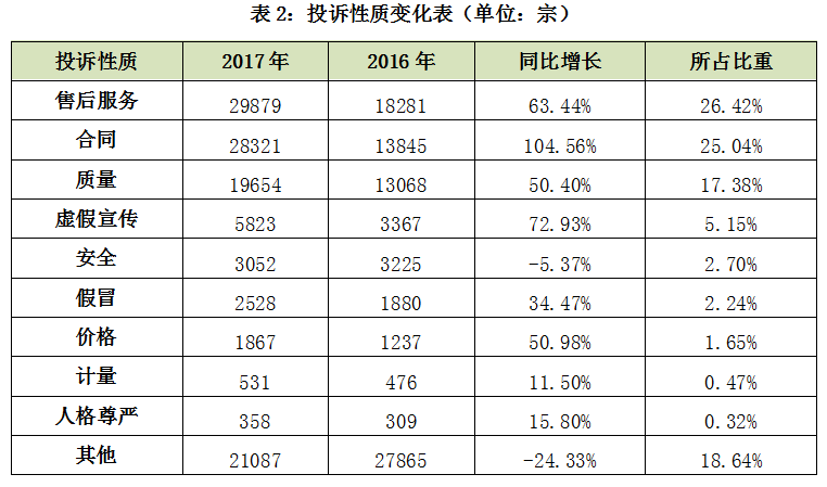 2017年,消費(fèi)者反映最突出的投訴性質(zhì)分別是售后服務(wù)29879宗,占26.42%;合同28321宗,占25.04%;質(zhì)量19654宗,占17.38%;三大性質(zhì)類(lèi)別的投訴占比都超過(guò)了15%。