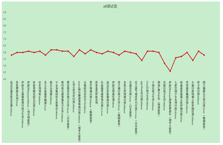 女性特殊時(shí)期的抗病能力大大降低,而與皮膚密切接觸的衛(wèi)生巾的酸堿度即pH值是關(guān)乎女性特殊時(shí)期健康的重要因素。據(jù)婦幼保健醫(yī)生介紹,衛(wèi)生巾的pH值在弱酸性至堿性對(duì)人體最安全。本次比較試驗(yàn)35款衛(wèi)生巾pH值測(cè)試結(jié)果均在4.5到6.5之間,對(duì)人體無害。pH值測(cè)試結(jié)果見下圖。