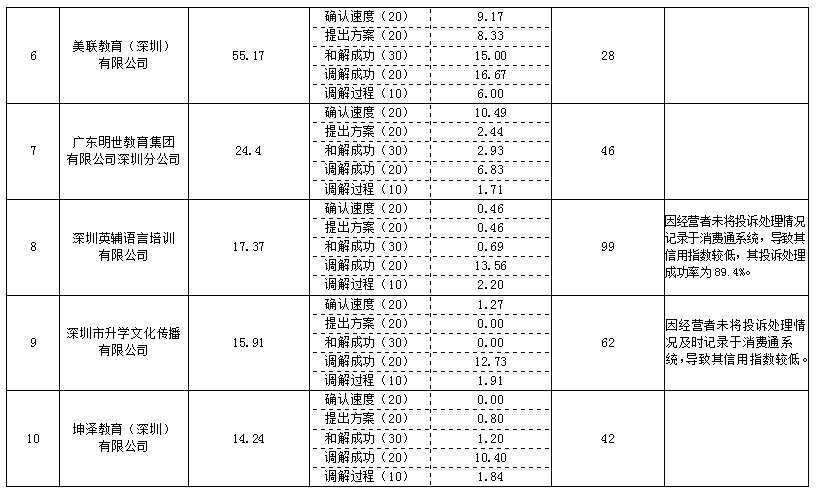 深圳英輔語言培訓(xùn)有限公司和深圳市升學文化傳播有限公司因經(jīng)營者未將投訴處理情況記錄于消費通系統(tǒng),導(dǎo)致兩家企業(yè)信用指數(shù)較低。其中深圳英輔語言培訓(xùn)有限公司投訴處理成功率為89.4%,因未記錄于消費通系統(tǒng),極大地影響其信用指數(shù)和排名。深圳市消委會在此提醒各行業(yè)企業(yè),重視消費者權(quán)益保護工作,及時處理消費者投訴、與消費者提早和解,嚴格按照消費通系統(tǒng)要求記錄投訴處理情況,體現(xiàn)消費維權(quán)信用對消費者的消費指導(dǎo)作用。