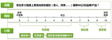 NPS計(jì)算模式:?請(qǐng)用戶回答“您在多大程度上愿意向您的朋友(親人、同事……)推薦XX公司/產(chǎn)品?”根據(jù)用戶的推薦意愿,將用戶分為三類(lèi):推薦者(得分在9-10之間)、被動(dòng)者(得分在7-8之間)、貶損者(得分在0-6之間)。?推薦者與貶損者是對(duì)企業(yè)實(shí)際的產(chǎn)品口碑有影響的用戶,推薦者與貶損者用戶在用戶總數(shù)中所占百分比之差,即凈推薦值,如右圖所示。?據(jù)相關(guān)調(diào)查顯示,大部分公司的NPS值在5-10之間。