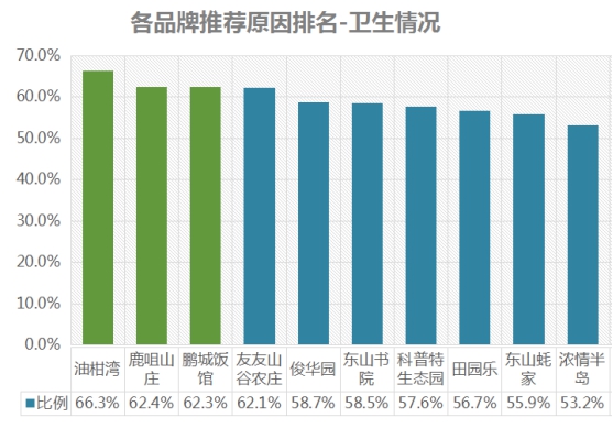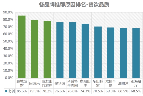 排名第一的是鵬城飯館,餐飲品質(zhì)推薦率為85.6%;其次是田園樂(lè),推薦率為79.5%;第三名是友友山谷農(nóng)莊,推薦率為78.2% 。