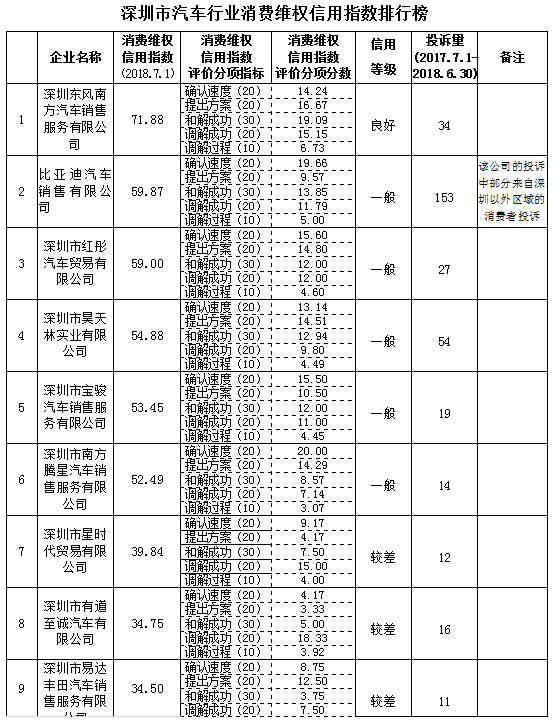 一、深圳市汽車行業(yè)消費維權信用指數排行榜