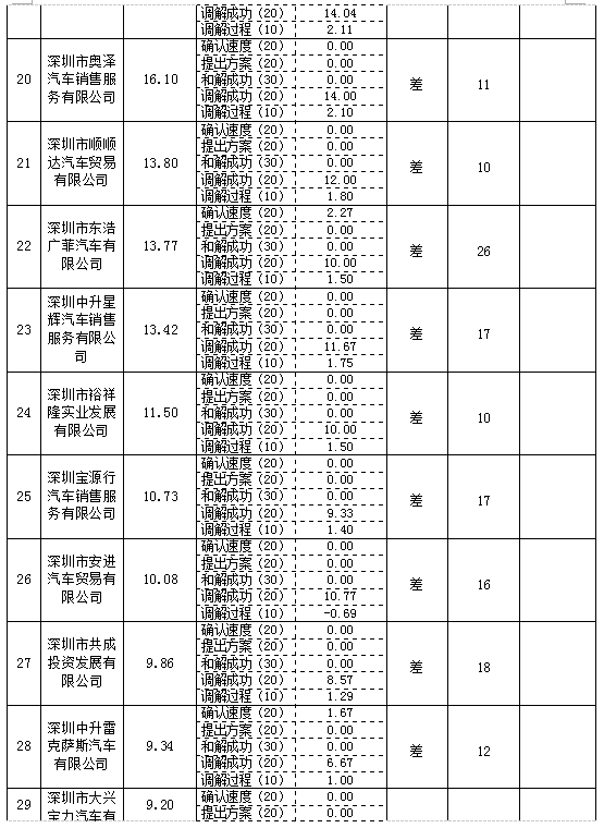 在細分指標方面,深圳市標域汽車有限公司、深圳標特汽車(集團)有限公司和深圳市宏創(chuàng)陸風汽車銷售有限公司等27家企業(yè)處理投訴不及時,未積極與消費者先行和解,導致其企業(yè)“確認速度”、“提出方案”和“和解成功”三項分項指標的分數皆為0,嚴重影響了企業(yè)的消費維權信用指數和信用等級。深圳市仁孚特力汽車服務有限公司、深圳市安進汽車貿易有限公司和深圳市大興寶譽汽車銷售服務有限公司在由消委會工作人員評分的“調解過程”分項指標分數為負分,3家企業(yè)存在不配合調解甚至拒絕調解的情況,解決消費糾紛的誠意度較差;另外,深圳市宏創(chuàng)陸風汽車銷售有限公司的消費維權信用指數為0,誠意度和滿意度為0,10宗消費投訴皆未處理成功,排名最后。