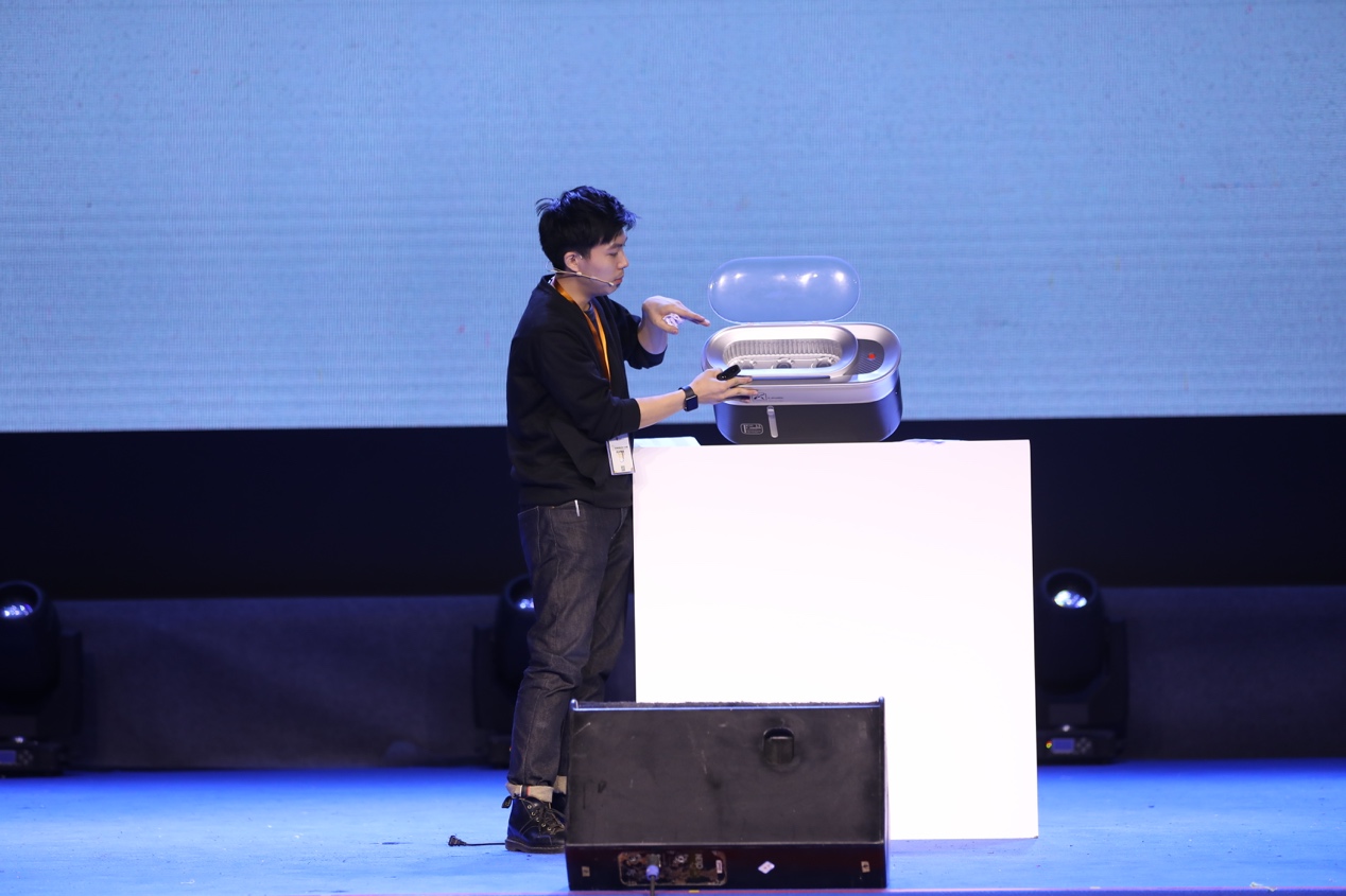 10件作品的設(shè)計(jì)師全部完成作品答辯后,7位評(píng)委進(jìn)入評(píng)審室進(jìn)行統(tǒng)計(jì)結(jié)果復(fù)議。在此期間,首屆金箍棒國(guó)際設(shè)計(jì)大獎(jiǎng)賽金獎(jiǎng)得主賈鵬,以及金箍棒工業(yè)產(chǎn)品設(shè)計(jì)江陰有限公司運(yùn)營(yíng)總監(jiān)何田鑫分別上臺(tái),為現(xiàn)場(chǎng)觀眾帶來(lái)產(chǎn)品設(shè)計(jì)和創(chuàng)業(yè)理念方面的分享,獲得了現(xiàn)場(chǎng)的陣陣掌聲。