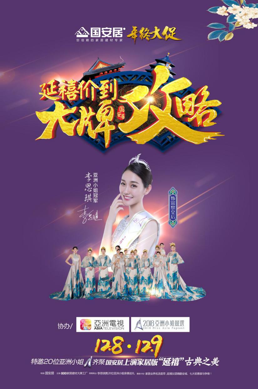 作為2018年收官之作,國安居非常重視此次年終盛典,力求將本次盛典做大做好,以回饋廣大新老顧客的長期支持與厚愛。為此,國安居本次特邀2016亞姐冠軍李思琪攜手20位2018亞洲小姐候選佳麗親臨國安居親善巡禮,集智慧與美麗于一身的亞姐佳麗帶您領(lǐng)略“延禧攻略”古典之美。為廣大業(yè)主獻(xiàn)上一場美輪美奐的古典文化視覺盛宴。