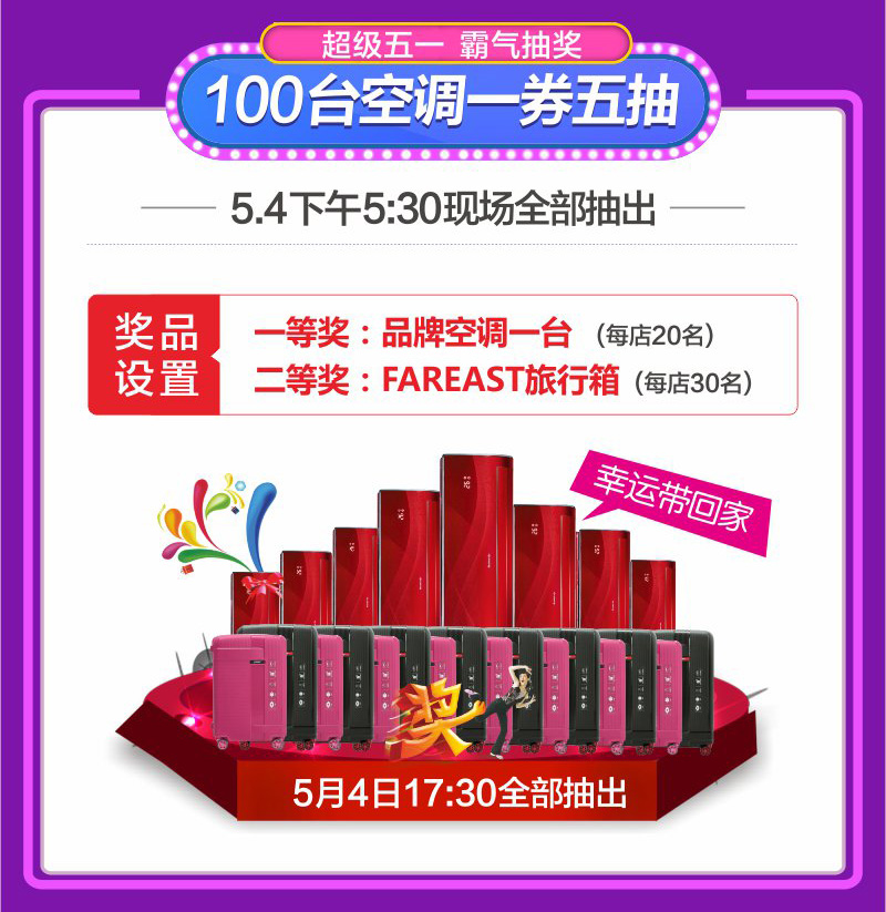 5、1元換購(gòu)FAREAST旅行箱:活動(dòng)期間,顧客凡在店內(nèi)下定實(shí)付(多個(gè)訂單可累積)滿5000元可加199元換購(gòu)22寸 FAREAST旅行箱;滿10000元可加一元換購(gòu)22寸 FAREAST旅行箱,滿20000元加一元換購(gòu)27寸FAREAST旅行箱,送完即止。