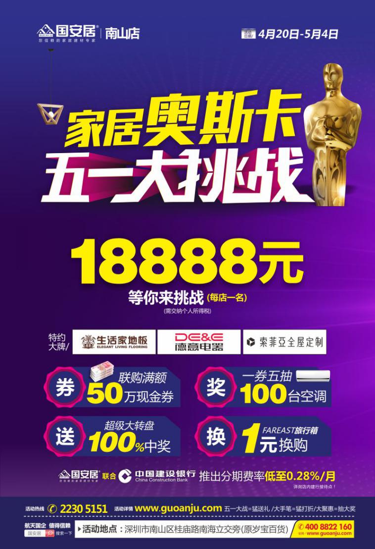 4月20號(hào)~5月4號(hào),南山國(guó)安居家居奧斯卡五一大挑戰(zhàn)盛大開啟,一大波福利和超值優(yōu)惠來襲,準(zhǔn)備好接招了嗎?