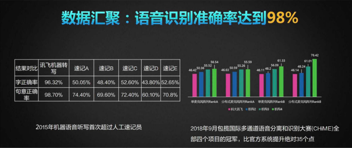 在英文語音識別、機(jī)器閱讀理解、國際識別挑戰(zhàn)賽等多個A.I.領(lǐng)域的國際賽事 中,科大訊飛均名列前茅, 至今已獲得12項世界第一。2018年9月,訊飛再次包攬國際多通道語音分離和識別大賽(CHiME-5)全部四個項目的冠軍,該大賽被稱為“史上最難語音識別任務(wù)”,考察的是在不同場景中自由交談的遠(yuǎn)場語音識別效果。也再次證實了訊飛語音識別在噪音、口音和遠(yuǎn)場識別挑戰(zhàn)下的絕對領(lǐng)先優(yōu)勢。與此同時,訊飛轉(zhuǎn)寫引擎于2005年開始應(yīng)用服務(wù),期間歷經(jīng)數(shù)次迭代升級。
