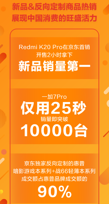 Redmi K20 Pro特地選擇在京東618期間首銷(xiāo),其中還針對(duì)京東的用戶(hù)推出了京東獨(dú)家版本,而Redmi K20 Pro的整體銷(xiāo)售成績(jī)也表現(xiàn)不俗,在開(kāi)售2小時(shí)就拿下新品銷(xiāo)量第一;而在京東618期間推出的一加7Pro,僅用了25秒就銷(xiāo)售上萬(wàn)部。