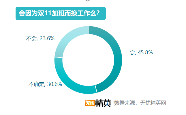 雙11過于辛苦,不少人會有工作上逃離雙11的想法。45.8%的職場精英因?yàn)殡p11加班過多,會有換工作的想法,不過,較2018年50.6 %的人有這種想法,已有所下降;30.6%的精英不確定要不要換工作,23.6%的職場精英則表示不會因?yàn)殡p11加班多而換工作。