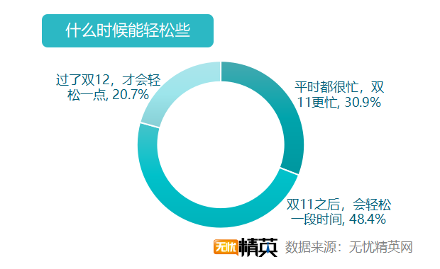 忙碌是工作的常態(tài),雙11只是更忙一點(diǎn)罷了。48.4%的受訪者表示雙11以后,會輕松一段時(shí)間;30.9%的職場精英表示,平時(shí)都很忙,只是雙11更加忙碌罷了;而20.7%的人,要過了雙十二才會輕松一點(diǎn)。年底的市場,一直是商家們的戰(zhàn)場,雙11以后,雙12、圣誕節(jié)、元旦、春節(jié)接踵而至,輕松只是短暫的停留,促銷才是長期的工作。