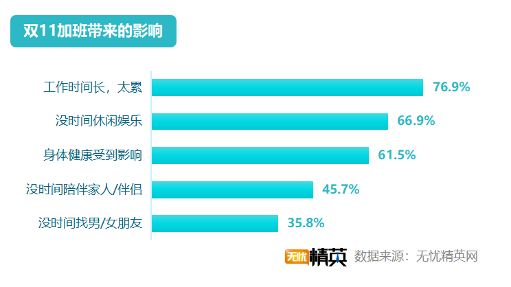 雙11高強(qiáng)度的加班,導(dǎo)致職場精英們的生活受到較大影響,76.9 %的人因?yàn)楣ぷ鲿r(shí)間過長,覺得太累;66.9 %的人因?yàn)榧影鄾]有時(shí)間休閑娛樂;61.5 %的人身體健康帶來影響;45.7 %的人沒時(shí)間陪伴家人/伴侶;更有35.8 %的人,將沒有男朋友/女朋友的鍋,扣到了雙11的頭上。
