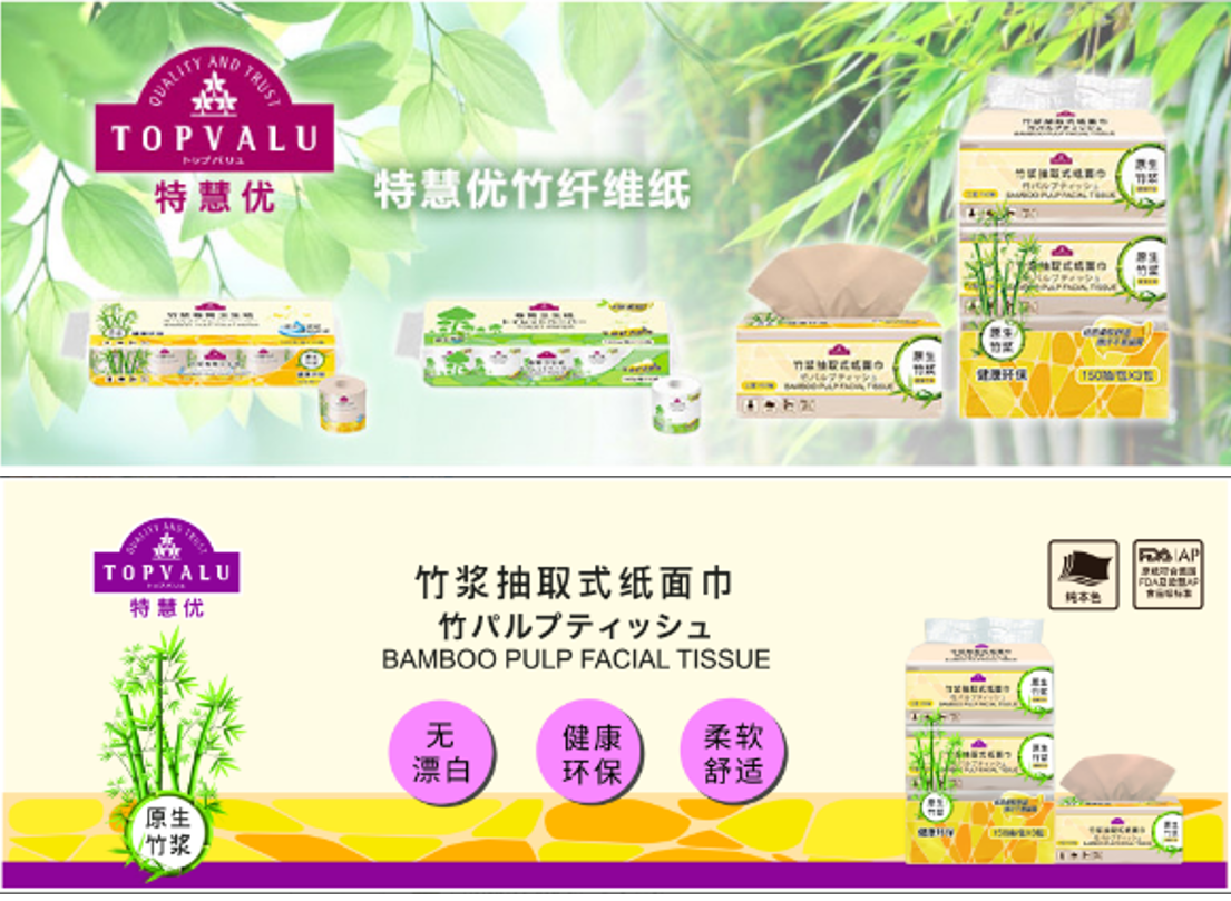永旺始終對(duì)環(huán)境保護(hù)高度關(guān)注,開(kāi)發(fā)健康、環(huán)保的、讓顧客放心使用的商品一直是永旺的目標(biāo)。正是出于這樣的考量,永旺自有品牌TOPVALU(特慧優(yōu))推出了竹漿抽取式紙面巾等系列的環(huán)境友好型商品。由于該商品做到了對(duì)環(huán)境無(wú)污染,對(duì)人體無(wú)危害,還獲得了“2018年中國(guó)零售自有品牌評(píng)選”的“綠色產(chǎn)品獎(jiǎng)”。