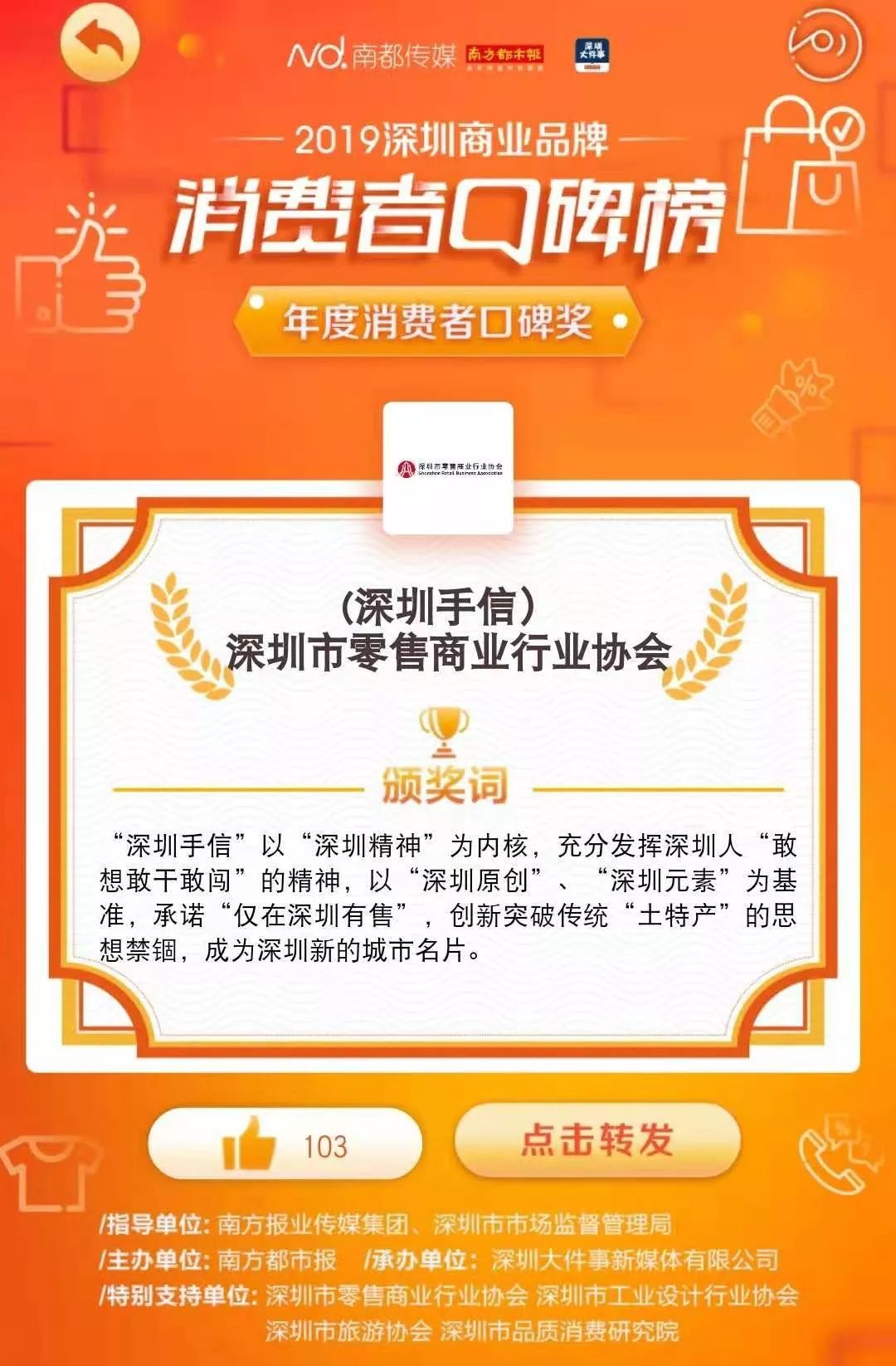 深圳手信作為深圳的城市品牌順利斬獲2019年“深圳商業(yè)品牌·消費者口碑榜”【年度口碑大獎】。作為城市之禮,“深圳手信強調(diào)“深圳精神”創(chuàng)新內(nèi)核,臻選一城好禮,所有產(chǎn)品來自深圳本土優(yōu)秀企業(yè)。