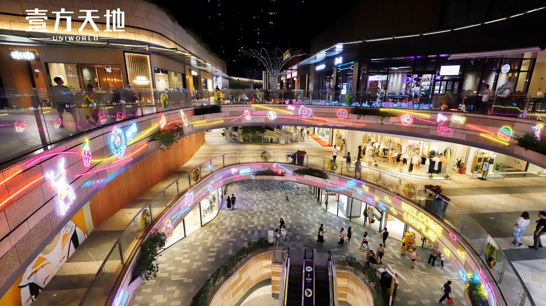 “顏值是第一生產(chǎn)力”,要打造夜間標(biāo)桿,氛圍營造必不可少。壹方天地將燈飾與建筑、綠植等多個元素巧妙結(jié)合,璀璨的景觀燈、夢幻的星星燈、妙趣橫生的IP主題霓虹燈烘托出獨具一格的藝術(shù)氛圍。夜晚時分搭配噴泉秀和噴霧,光影夢幻,玉壺光轉(zhuǎn),營造出極富層次感的夜景。同時,通過加強外圍的燈光照明等,持續(xù)亮化夜間氛圍,壹方天地成為夜間休閑、聚會的絕佳場所。“消費者沒事也喜歡來走一走,享受工作之余的休閑時光?!迸藸N峰說道。