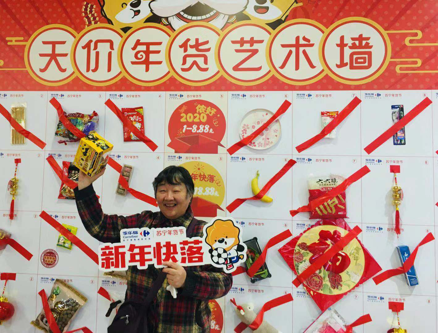 1月10日上午,記者來(lái)到家樂(lè)?!澳晡豆狻碧靸r(jià)年貨藝術(shù)墻的活動(dòng)現(xiàn)場(chǎng),眾多市民正想躍躍欲試。記者發(fā)現(xiàn),在天價(jià)年貨藝術(shù)墻上,有儂好2020、新年快落、腔調(diào)哈濃、年貨老嗲、“鼠”儂最美五類(lèi)天價(jià)年貨。