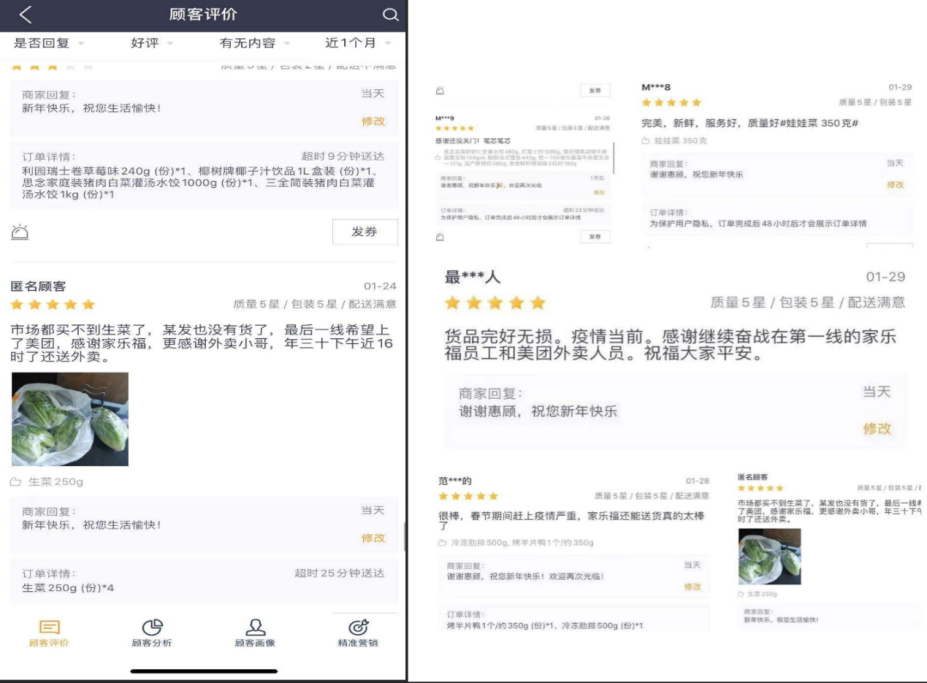 “因新型肺炎病毒的爆發(fā),從大年初二開始,蔬菜、肉類等民生用品成為了市民門的‘搶手貨’,家樂福門店的外賣平臺配送新訂單突然增長,單日訂單量突破上百,很快又到幾百,甚至更多……單個(gè)訂單的商品種類多至120件,訂單價(jià)格超過3000元,每天每個(gè)門店平均需要撥打300通以上的電話。”家樂福華南區(qū)電商經(jīng)理黃福填告訴我們,面對每天逐漸增長的訂單量,自己既是喜悅又是焦慮。為了讓更多顧客享受快捷方便的家樂?!芭渌偷郊摇睒I(yè)務(wù),許多門店的伙伴跟他一樣主動放棄春節(jié)假期,堅(jiān)守一線。