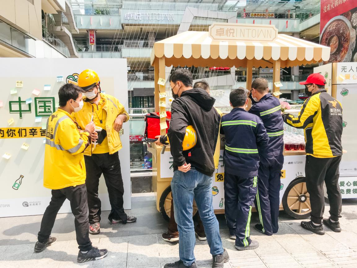 3月3日至3月8日卓悅INTOWN在街頭專設(shè)了一個(gè)”無人值守愛心站”,用愛心餐車上放滿了食物冷/熱飲,專門免費(fèi)贈(zèng)送給快遞、外賣小哥、環(huán)衛(wèi)工人、警察、城管等一線奔波的人員。