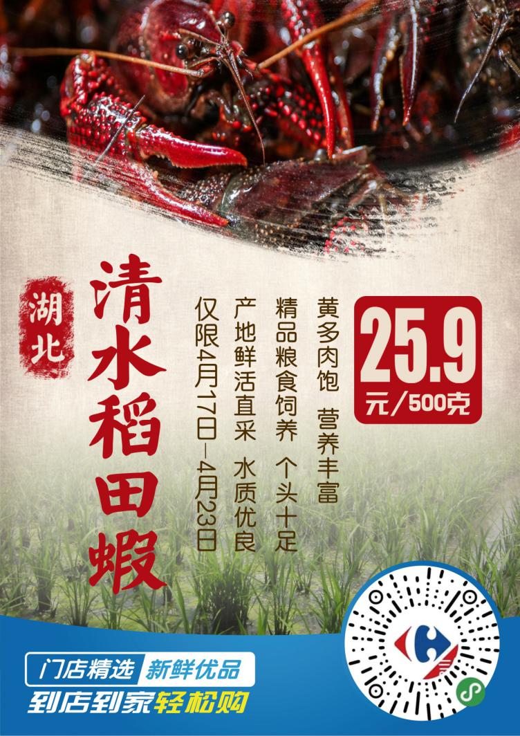 15號(hào)開始捕撈的這批湖北“清水稻田蝦”將于16號(hào)完成分揀裝車,發(fā)往家樂福全國(guó)各地大倉(cāng),17號(hào),家樂福位于北京,上海、哈爾濱,長(zhǎng)沙,成都,昆明,廣州,深圳等地的155家門店鮮活開售,恰逢家樂福418購(gòu)物節(jié),嘗鮮價(jià)低到25.9元/500克(僅限4月17日至23日)。同時(shí),顧客還可以通過家樂福小程序、蘇寧易購(gòu)app、蘇寧小店App、及美團(tuán)、餓了么下單,享受1小時(shí)送到家的極致“鮮“體驗(yàn)。