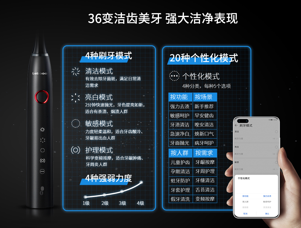 值得一提的是,力博得智能聲波牙刷·星鉆內(nèi)置壓力傳感系統(tǒng),具有36種潔齒檔位,4種潔齒模式和4級(jí)力度調(diào)節(jié)。強(qiáng)勁清潔模式:滿(mǎn)足日常清潔需求;拋光亮白模式:適合追求亮白人士;溫和敏感模式:適合牙齦易出血人群;輕柔護(hù)理模式:為牙病問(wèn)題而生,體貼入微。以上模式各有1-4級(jí)力度調(diào)節(jié),更加人性化。