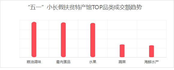借助“五一”小長假及線上消費(fèi)增長的勢頭,各地的線上扶貧特產(chǎn)館成交額同比增長了135%。各產(chǎn)地的糧油調(diào)味、禽肉蛋品、水果、蔬菜及海鮮水產(chǎn)等特產(chǎn)的成交額最高。