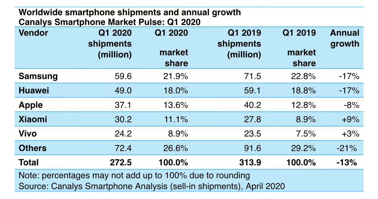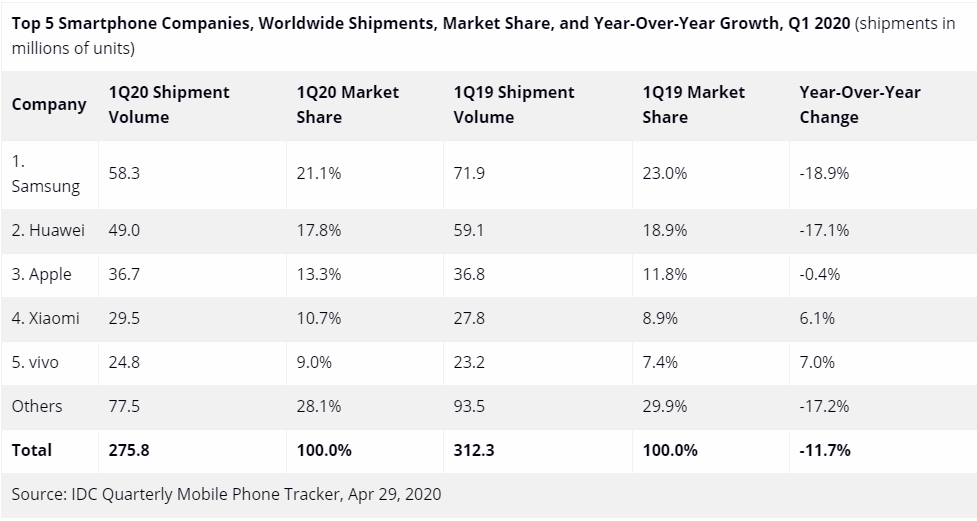 見圳客戶端·深圳新聞網(wǎng)2020年5月6日訊 國際權威機構IDC最新報告顯示,全球智能手機出貨量在2020年第一季度同比下降11.7%。其中,三星、華為、蘋果依舊穩(wěn)居前三,分別為21.1%、17.8%和13.3%。