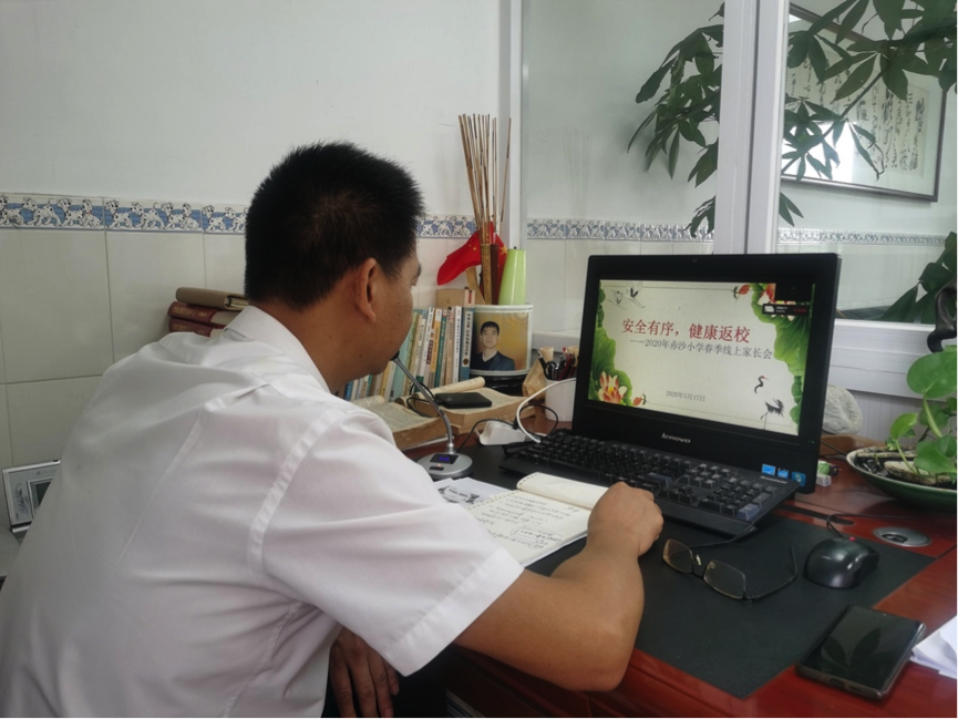 赤沙小學(xué)校長李錦賢通過企業(yè)微信召開復(fù)學(xué)前的線上家長會(huì)。