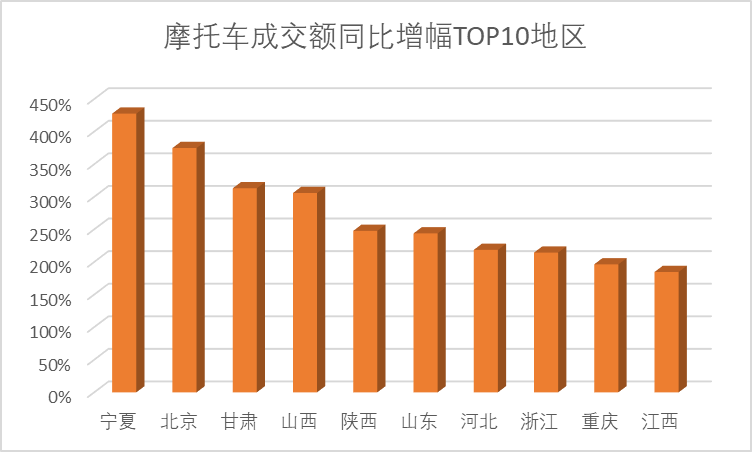 頭盔取得高速增長(zhǎng)的同時(shí),摩托車、電動(dòng)車的成交額增幅也分別超過(guò)110%和50%。寧夏、北京、甘肅、陜西等地區(qū)摩托車成交額同比增幅較高,而西藏、北京、寧夏、甘肅等地區(qū)的電動(dòng)車成交額同比增幅較高。