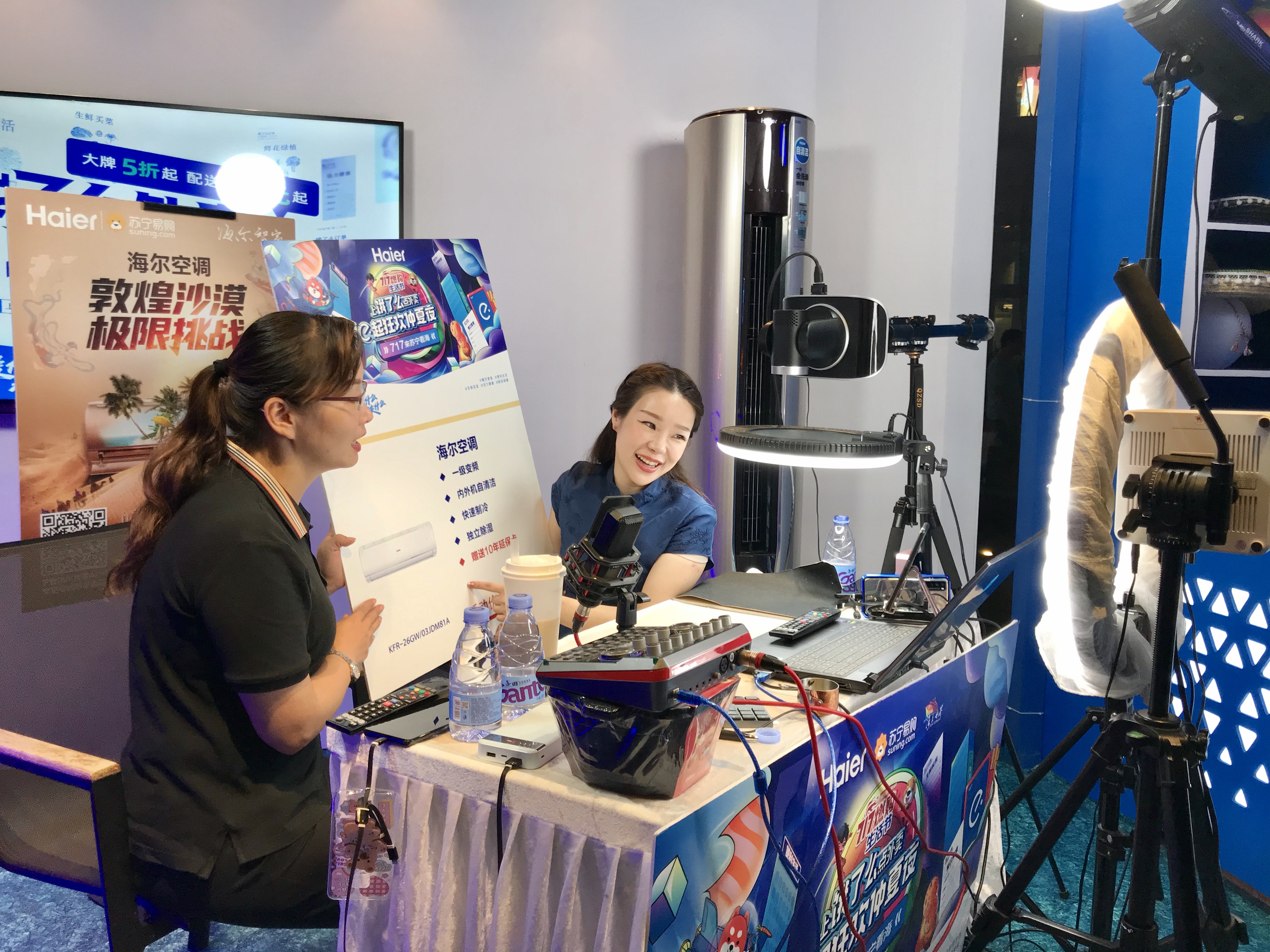 市集的中心部分為V R體驗(yàn)館和網(wǎng)紅直播間,在這里你可以體驗(yàn)到高科技的V R游戲,還可以看見(jiàn)網(wǎng)紅夢(mèng)如親臨現(xiàn)場(chǎng)直播,讓沒(méi)能來(lái)到海上世界的觀眾們也感受到現(xiàn)場(chǎng)的火熱。