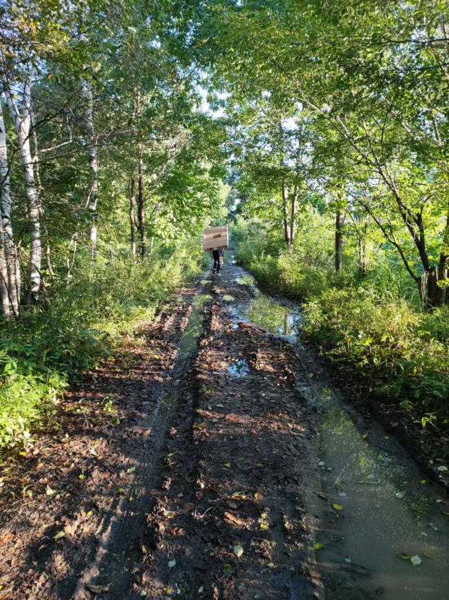 一路開(kāi)下來(lái),車身濺起不少泥垢??斓侥康牡貢r(shí),一段泥濘的林間小路攔住了王能的去路。原來(lái),道路積水過(guò)多,泥土過(guò)軟,車輛不能前行。王能隨即將車??吭诼愤?,直接卷上褲腿,扛起電視前行。兩公里的林間路,本就不輕松,扛著電視更是“難上加難”。