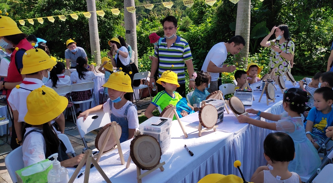 在自然課堂,分為科普展覽區(qū)、繪畫活動區(qū)和蜂產(chǎn)品體驗區(qū),孩子們戴著黃色的卡通帽子,像一只只勤勞的小蜜蜂忙碌地參與各項活動。在科普展板前,他們認真記錄蜜蜂的基本知識、品質(zhì)精神,了解蜜蜂與人類的關(guān)系、保護生物多樣性的重要性,家長們結(jié)合展板耐心講解《深圳經(jīng)濟特區(qū)科學(xué)技術(shù)普及條例》、全國科普日、深圳科普月等知識。