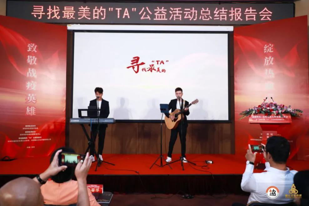 活動(dòng)尾聲,會(huì)場(chǎng)響起一首滿懷敬意及祝愿的歌聲——尋找最美的“TA”公益活動(dòng)主題曲《無(wú)名英雄》。這是由畢業(yè)于中國(guó)音樂(lè)學(xué)院并多次參演央視春晚、與郎朗同臺(tái)演奏的孫培軒與民謠吉他創(chuàng)作歌手強(qiáng)曉龍共同親情獻(xiàn)唱的原創(chuàng)戰(zhàn)疫歌曲,現(xiàn)場(chǎng)的各位嘉賓及觀眾無(wú)不感動(dòng),感謝無(wú)名的英雄們用那堅(jiān)如磐石的雙肩,踐行著初心使命及鏗鏘有力的誓言。