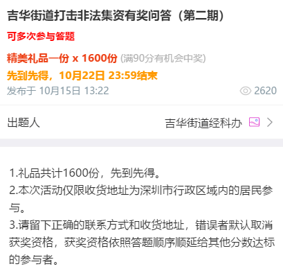 此外,為加強宣傳效果,提升居民對非法集資知識的知曉率,提高居民參與打擊非法集資的熱情,吉華街道經(jīng)科辦還開展了打擊非法集資知識有獎問答活動和轉(zhuǎn)發(fā)打擊非法集資宣傳推文朋友圈打卡活動,以這種富有趣味性、知識性的活動形式,切實普及打擊非法集資相關(guān)知識,提高居民自我保護能力?;顒庸灿?000余民轄區(qū)居民參與,派發(fā)禮品2000份。
